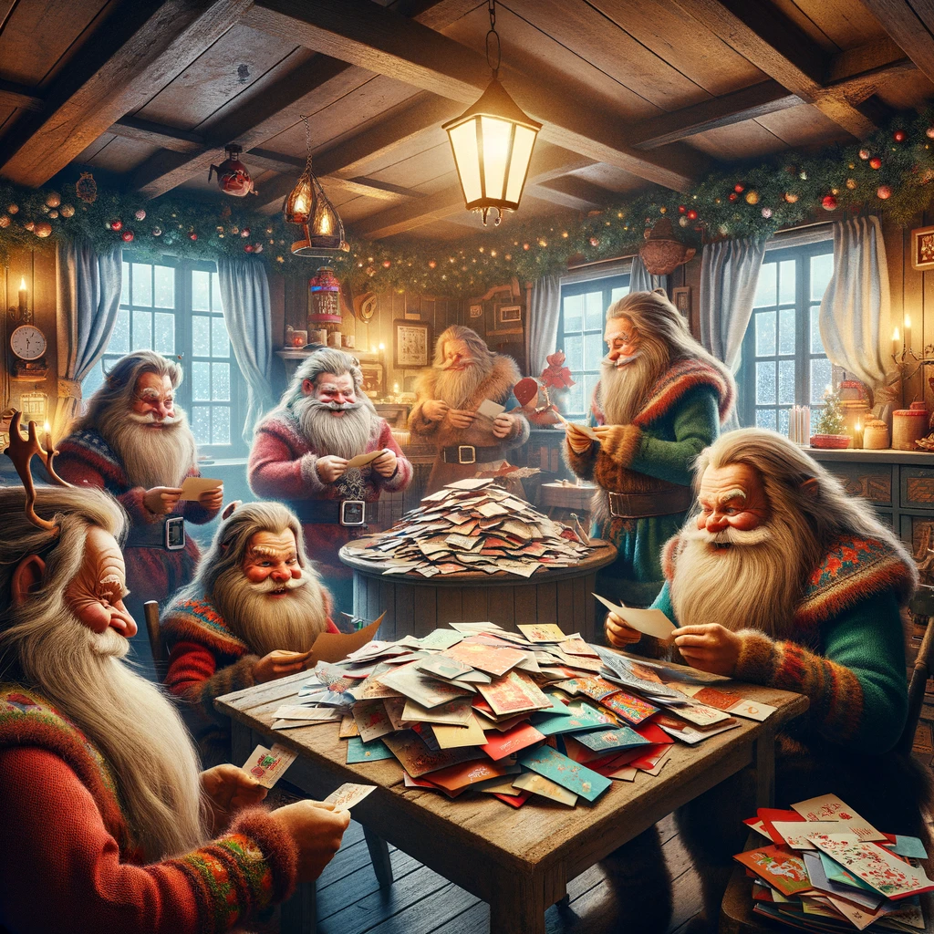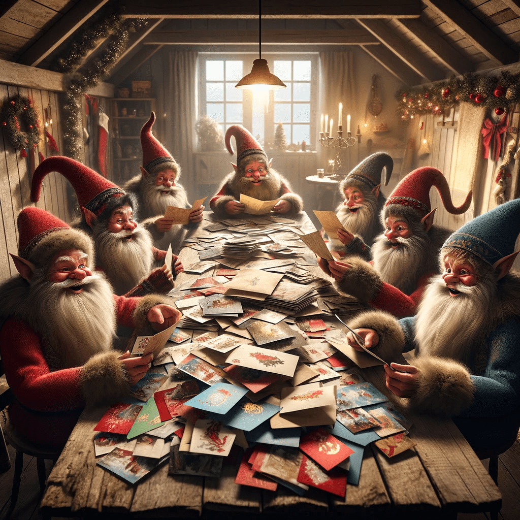 Here is DALL-E 3’s take on the Yule Lads receiving and opening Christmas cards sent to them in the post to their home in Iceland.