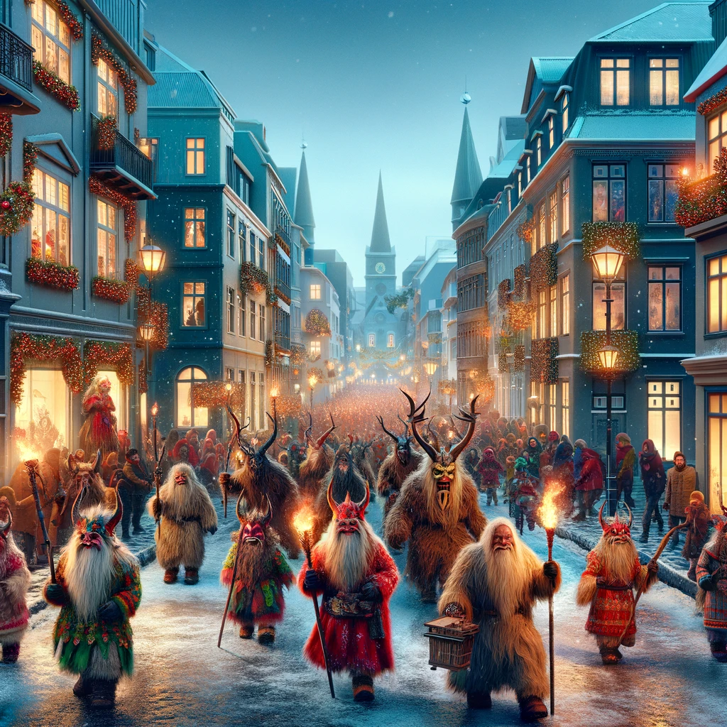 In order to capture the exuberance of Simbang Gabi in the Philippines, DALL-E 3 imagines the Yule Lads wearing traditional clothes walking in a Manila street full of street vendors selling traditional food.